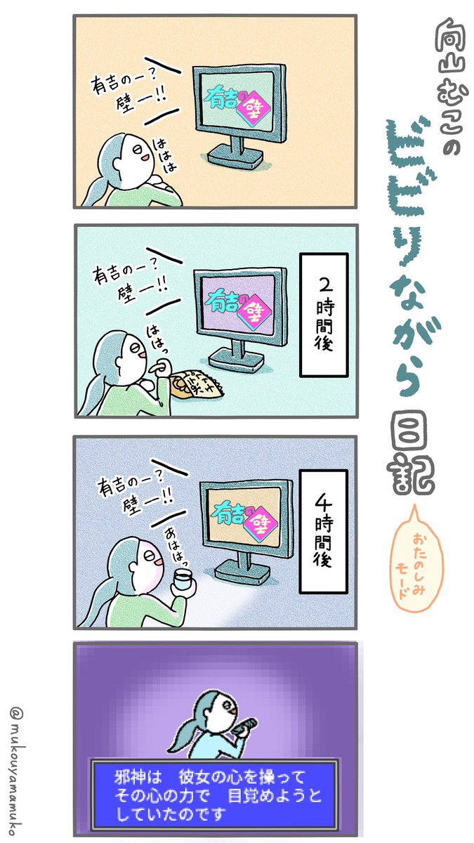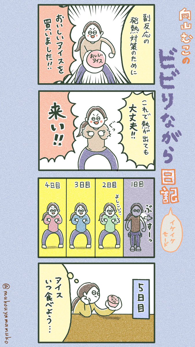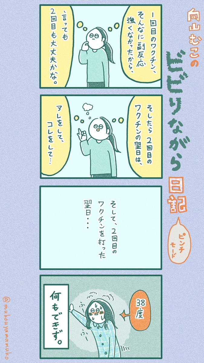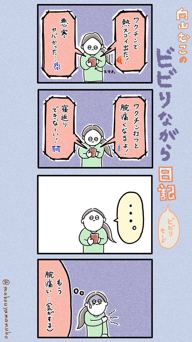 だいぶ前の話ですが、昨年12月初めに2回目のコロナワクチン打ちました。 その後2ヶ月くらい経ってやっと肩の痛みが落ち着きました…。2回目おそるべし…! あと「脇が痛む」っていう罠もあったのですね…😂 #絵日記 #4コマ #エッセイ漫画 #漫画が読めるハッシュタグ #向山むこのビビりながら日記