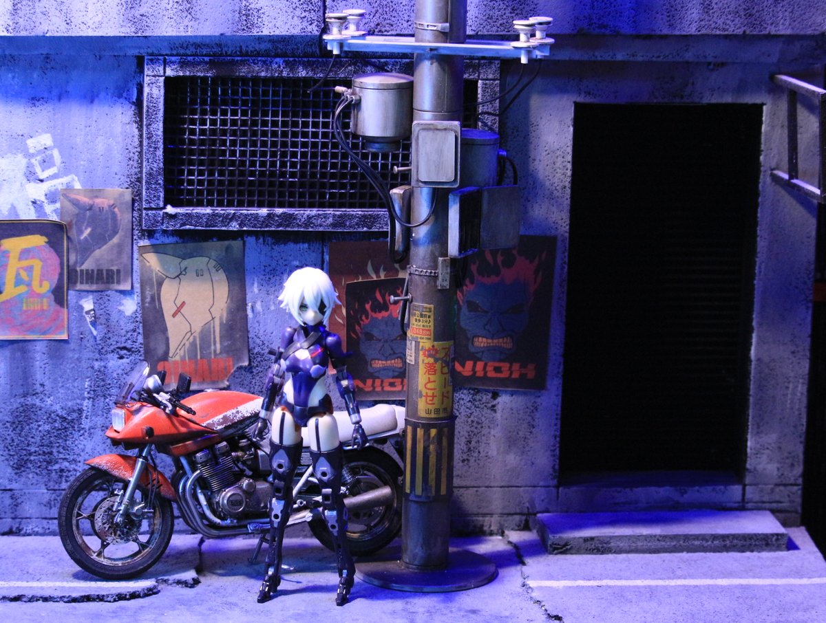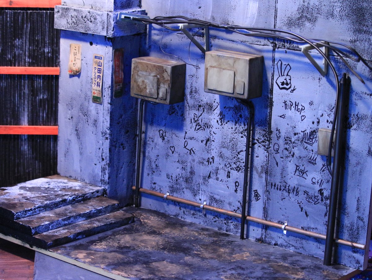 92 395 ストリートな路地裏つくりました。 電信柱で余ったシールをアルミ板に貼って看板のようにしてみました、かっこいい。 以前つくった電信柱をおいてみましたがやっぱりでかいですね。 23/06/28 18:39