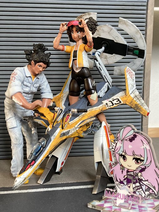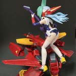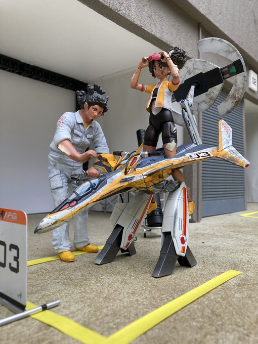 #マクロスモデラーズ応募 「ピットイン」 成長したチャックの妹エリザベスがV.F.G.レースに出場。混戦の中クラッシュし機体脚部が大破。パーツの予備も無くリタイヤを迫られるが、応援に来ていたハヤテが、自身の普段乗り用V.F.マシンの脚部を提供。エリザベスは再びゴールを目指す!という妄想です。