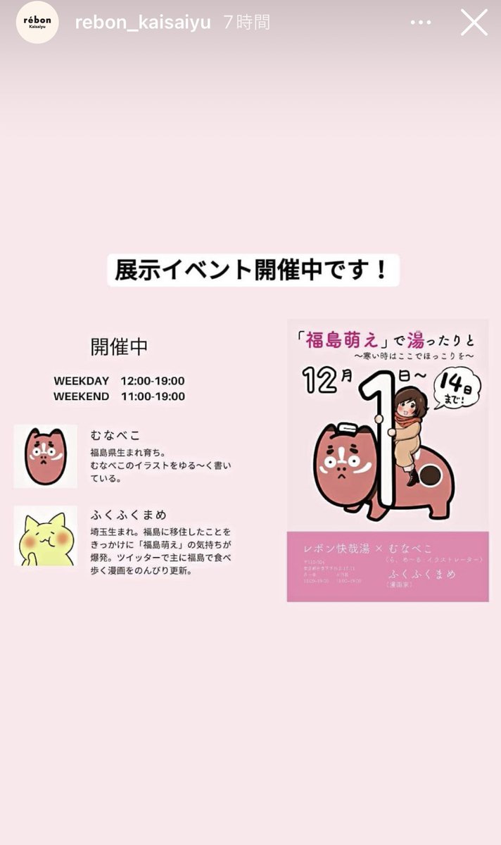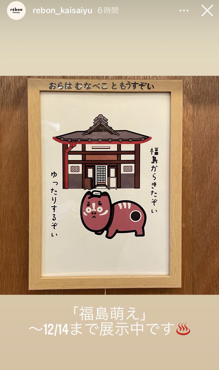 10 27 おばんでございナス🍆14日まで銭湯カフェ「レボン快哉湯」さんで、ふくふくまめ(@3v64GDgTx1nDYRT)さんとマンガとイラスト展示してるぞ〜い!沢山の方々が見て「福島萌え」でほっこりくれてるから嬉しいない〜❤️ まだ見てない人は是非だゾイ!#イラスト #展示 #東京 21/12/06 20:23