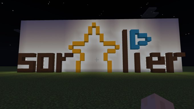 マイクラのブロックでどうなるか見てみた。☆の位置をひとマス右に寄せるとバランスよくなるかしら 【ロゴそのものの材料】 茶色のテラコッタ:72 黄色のコンクリート:31 空色のコンクリート:12 エンドロッド(文字の背後に明かりを灯す場合):115 #soraArt #ししらーと