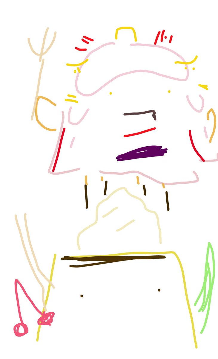 5歳の姪っ子が描いたクイーン。 姪っ子「ランチ作ったよ~おいしい昼ごはんだよ~」 #こうもり美術館