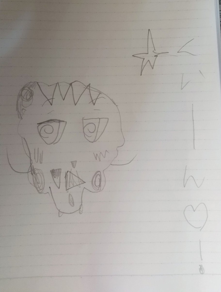 1 9 5歳の姪っ子が描いたクイーン。 姪っ子「ランチ作ったよ~おいしい昼ごはんだよ~」 #こうもり美術館 20/12/06 13:17