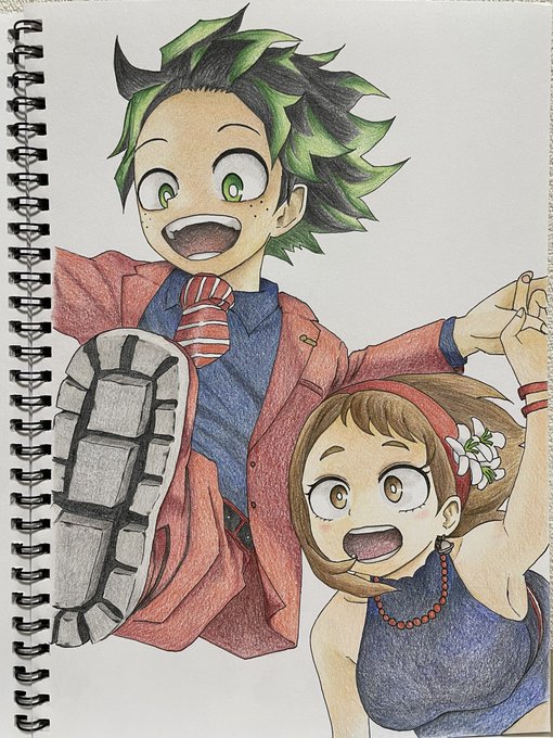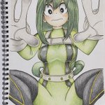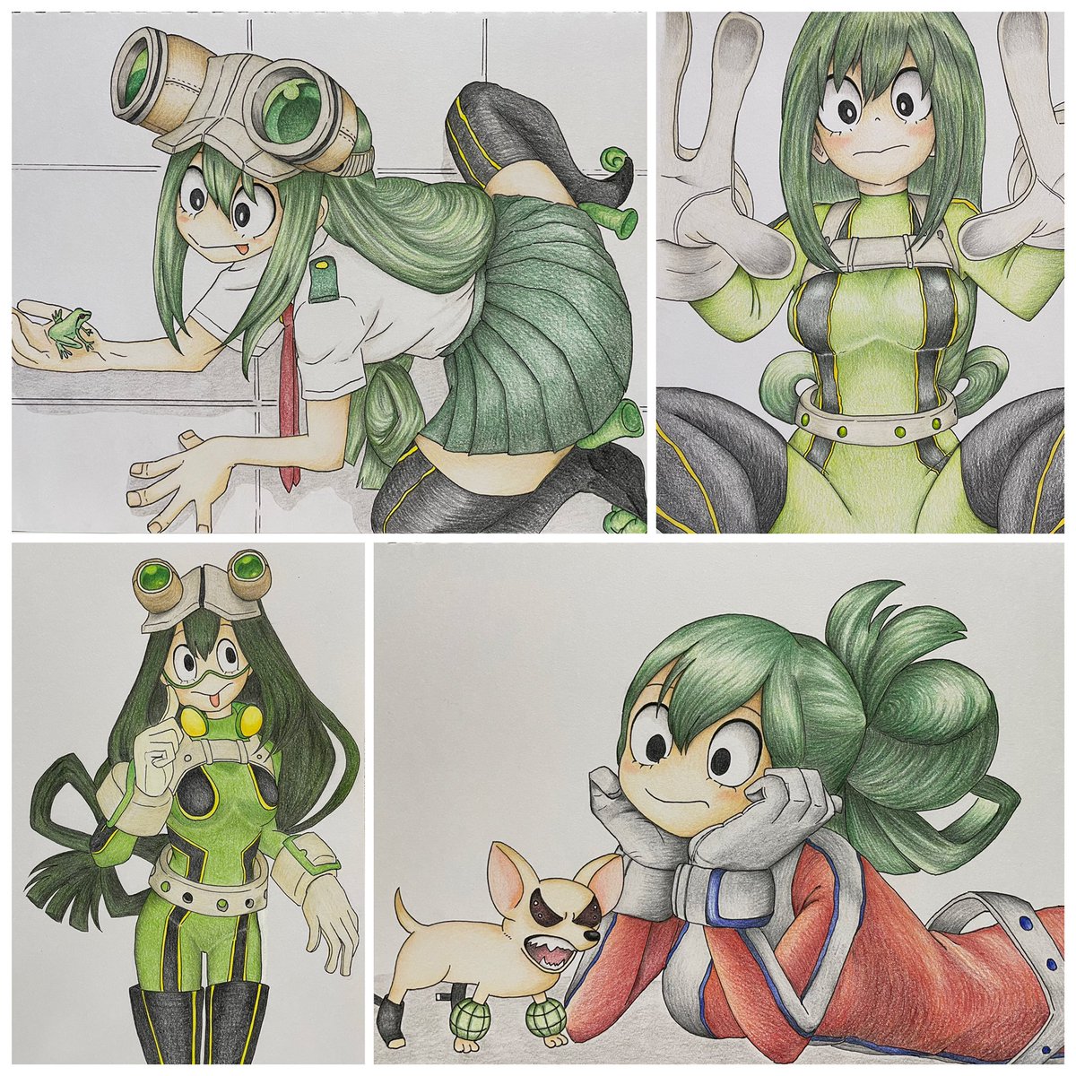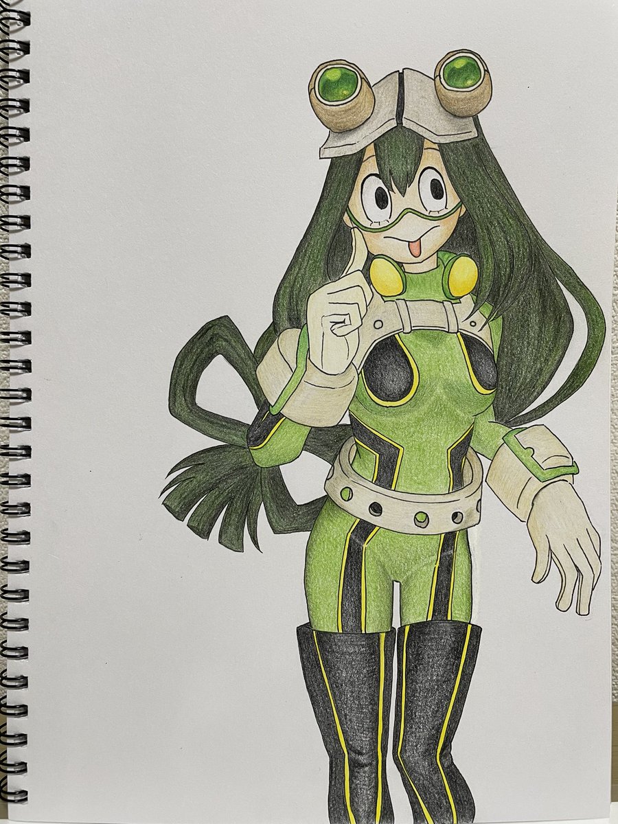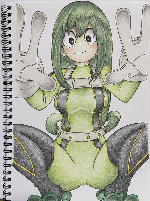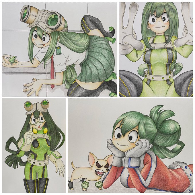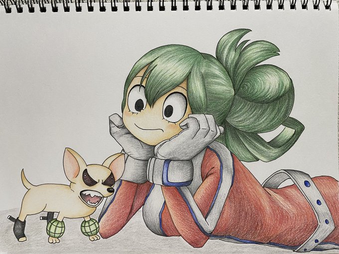 梅雨ちゃんとバクドッグ 元絵の梅雨ちゃん下向いてるけど何見てるのかな〜って想像して勝手にバクドッグを配置 梅雨ちゃんのヒロス 元絵が赤だったのでそのまま赤で塗ったけど赤は難しかったです… #僕のヒーローアカデミア #模写 #色鉛筆