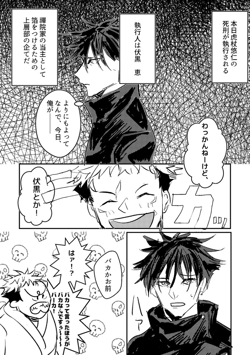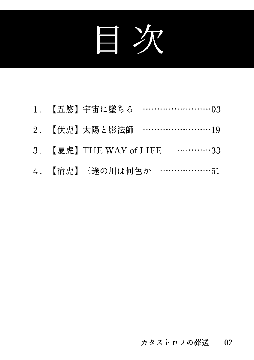 7 40 7/23頒布予定の新刊サンプルです! 「カタストロフの葬送」A5/54p/全年齢/500円(会場頒布予定価格) 虎杖くんが死刑執行されるお話を描いた短編集。収録CPは【五悠/めぐゆじ/夏虎/宿虎】です! ※死ネタ ※暴力表現アリ 22/07/18 23:52