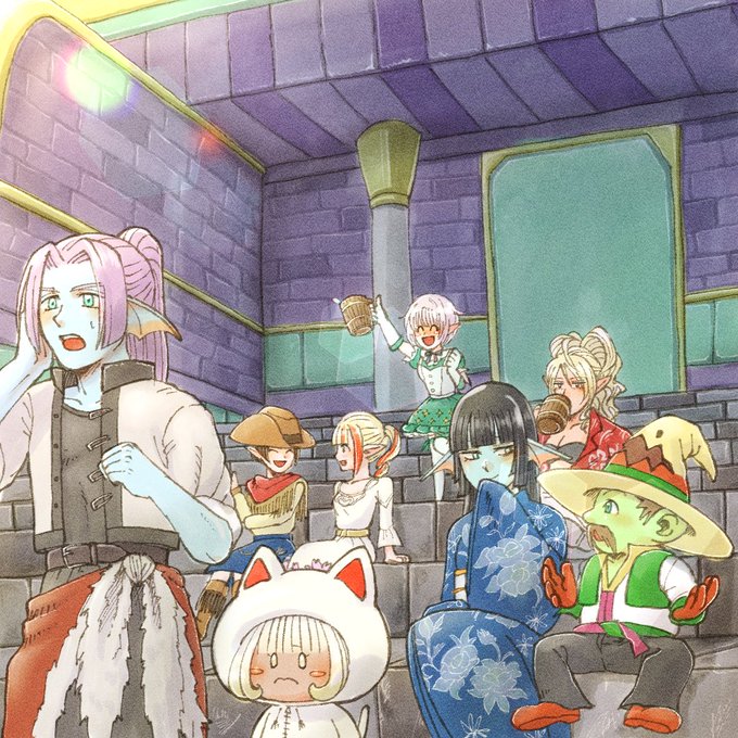 #100日チャレンジ 6、お題箱より「モンバト中のプレイヤー」 先日チームでバラシュナ討伐をさせて頂いた時のメンバーをお借りして、観客席で自分のモンスターを応援中のプレイヤーを描いてみました! バラシュナ未体験組は心配そうに、聖守護者ガチ勢は余裕の観戦態度です ありがとうございました!