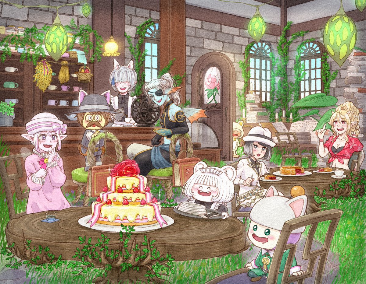 #100日チャレンジ 16、お題箱より「てりぽん応援イラスト(意訳)」 カフェ「あおぞら」 今日は特別な日!臨時バイトも雇って大きなケーキも作って大忙し💦店長急いで!チムメンが外で待機列作ってるみたい⁉️ てりぽんガーデン内の喫茶店で推しを寿ぐてりさんとチムメンです!てりさん元気出して💪