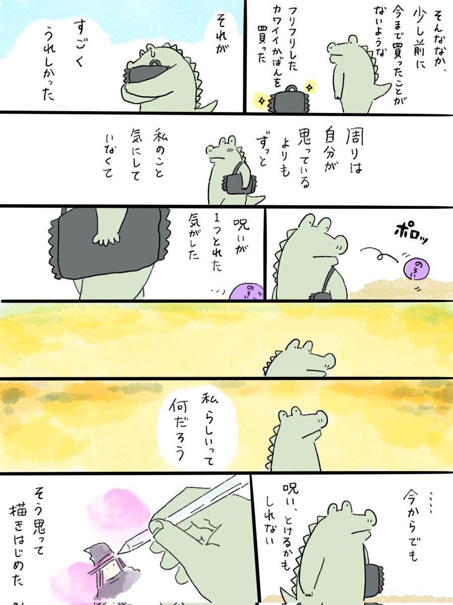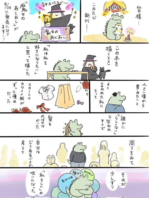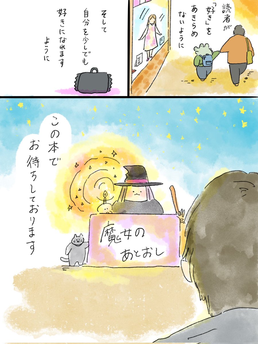 【ご報告】本日、新刊「魔女のあとおし」が発売になりました😭🎉🎉🎉🎉 自分を好きになりたい。という気持ちと、絵本に入りたいという気持ちから描いた一冊です。よかったら、Amazonなどで評価、感想などいただけますと作者が奈良で海ができるくらい泣いて喜びます…😭🙇♂️🙇♂️🙇♂️🙇♂️… twitter.com/i/web/status/1…