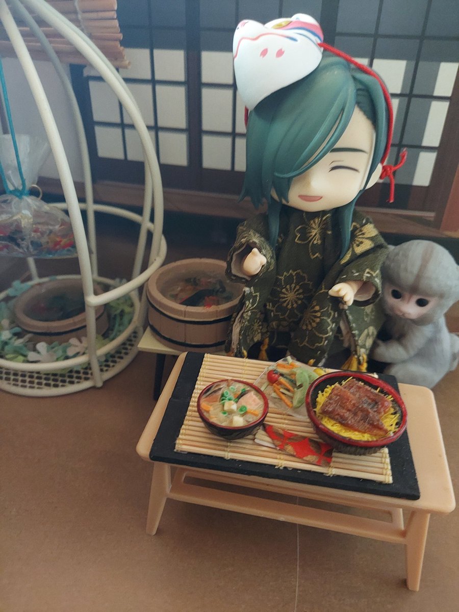 青江「主、この間の鰻調理してもらったぞ😊勿論、一口『あーん』してくれるんだよね❤️」 主「ありがとー😆💕…ねぇ青江チャン、その…えっとそのお猿さんは?」 青江「散歩してたら懐かれて一緒に居たいって言うから連れて来たんだよ😃」 #刀剣乱舞 #オモ写