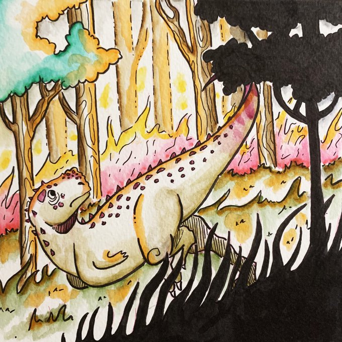 Day 5: Flame. Chenanisaurus was one of the last dinosaurs alive before the mass-extinction. The mass-extinction that caused havoc on the entirety of the environment, including wildfires. #inktober #inktober2022 #paleoart #illustration #dinosaur