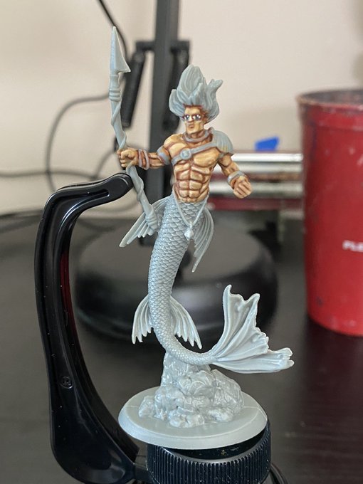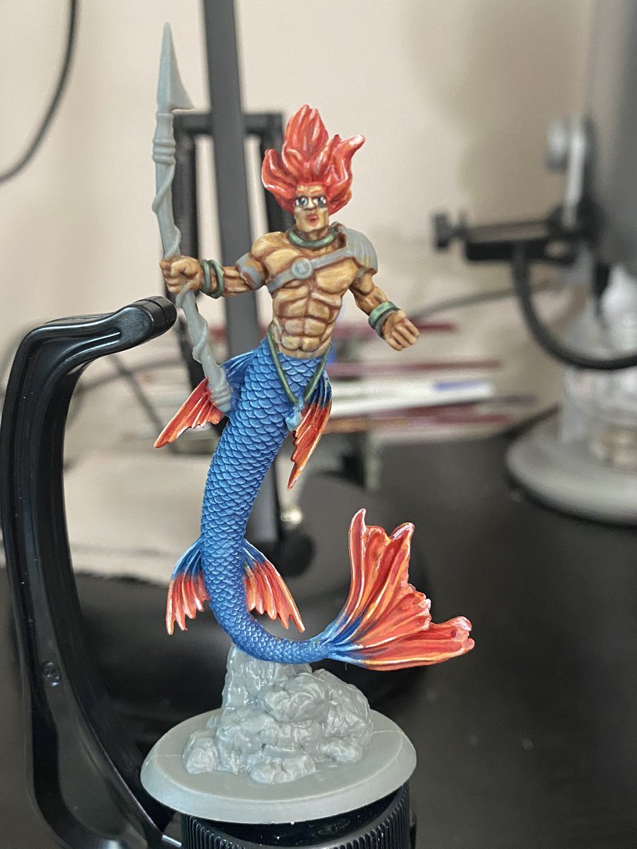 From yesterday’s stream and day 126 of my #hobbystreak, here’s the progress I made on my #mermay @reapermini Bones 5 merman. With that jawline and those abs, I’m calling him “Conan the mermanian.”