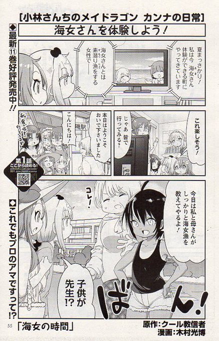 月刊アクション発売中!カンナの日常載ってます!今回は海女さん体験をするカンナちゃん!夏の海へGo!本家メイドラゴン、エルマ、ルコア、ファフニールのスピンオフと共によろしくお願いします!