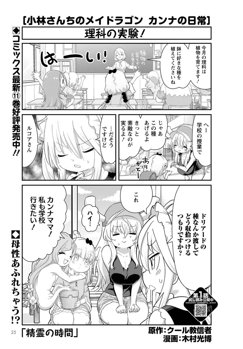本日発売の月刊アクションに「カンナ日常」載ってます!記念すべき10周年に掲載できて嬉しいですね😊今回は植物を育てたら精霊ドリアードになっちゃった!カンナをママと慕う異種間コミュニケーションのお話!本家メイドラゴン、エルマ、ルコア、ファフニールのスピンオフと共によろしくお願いします!