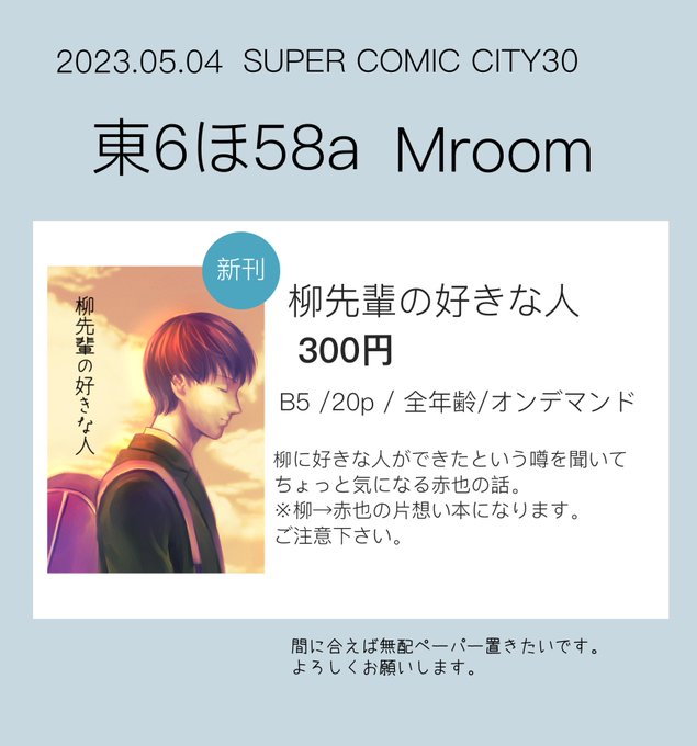 7 24 5/4 全国大会Ω お品書き 新刊サンプル B5/表紙込み20p/全年齢/300円/オンデマンド 柳赤表記ですが柳→赤片想い本になります。ご注意下さい。 23/05/01 15:31