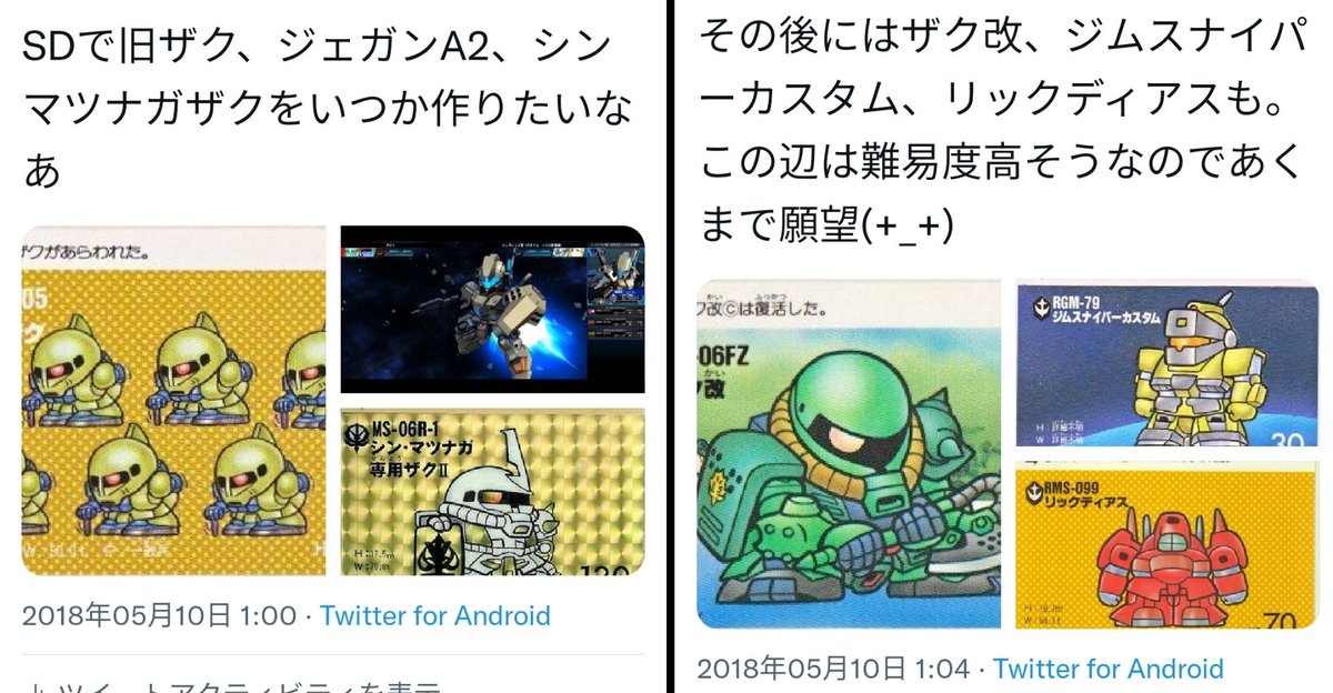 20 109 2018年5月の作りたいものツイート、この前完成したシンマツナガザクで6体全部達成してるのに気づいた!やったぜ🎉 #SDガンダム #BB戦士 21/09/30 22:35