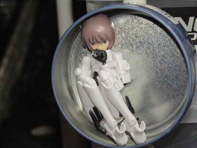 あとちょっと違う話題なので別ツリーにするんですが、百均で買った小物を使って撮影したやつ。(磁石でくっつく小物入れの蓋を外して適当なとこにくっつけて撮影) #メガミデバイス