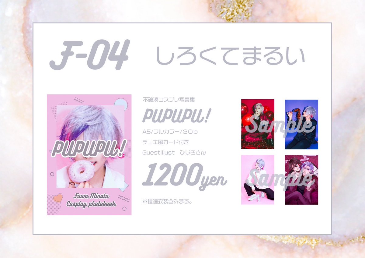 11 17 【5/5 #にじそうさく07】 ……………………………………… 【F-04 しろくてまるい】 🥂お品書き✨ ◯cosplay photobook A5/30p/チェキ風カード付き/¥1200 ◯image pierce all ¥1300 !どちらも数少なめです !お取り置き希望の方はDMへ 23/04/21 19:03