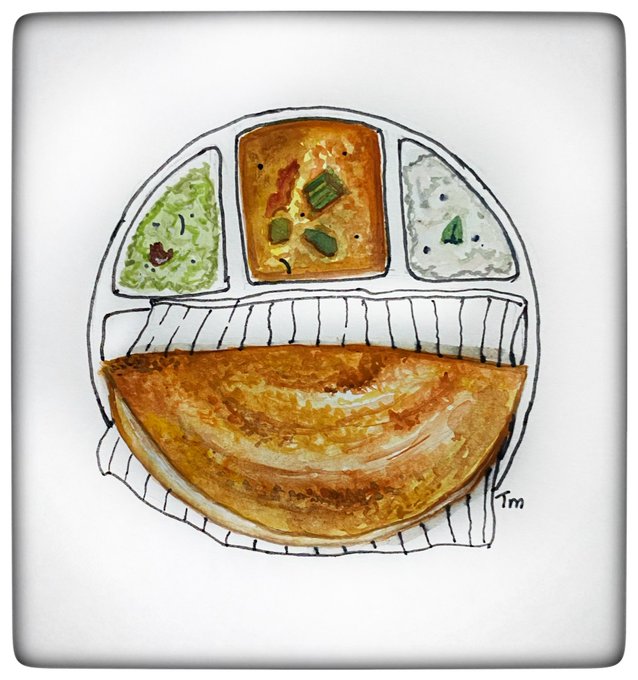 Inktober 2021 Day 27: Crispy The slightly sour crisp bits of dosa dunked in piping hot sambar and coconut chutney is bliss! #inktober #inktober2021 #crispy #dosa #foodart #watercolourpainting #watercolorpainting #arttherapy #indianfood #southindianfood #southindiancuisine