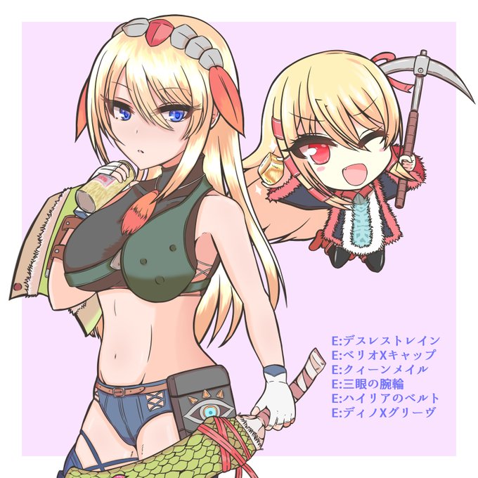 19 38 MHXXに出張したうちのこ二人のパツキンのハンターとオトモライムレアを描きました。飲んでいるのは元気ドリンコ(アルコール度数7%)です 20/10/31 18:36