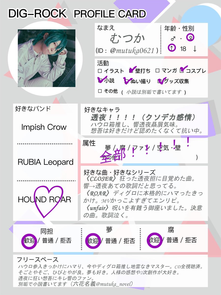 #DIGROCK好きさんと繋がりたい #ディグロ好きさんと繋がりたい テンプレお借りしました! コスプレ垢の他に小説垢(@mutuka_novel )もあります。 ディグロのお話たくさんしたいです✨✨ 専用垢ではなく、雑多日常コスプレ垢ですすみません🙏