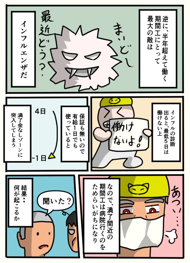 5 45 期間工がヨシッ! 第92話 有給休暇とインフル、 ヨシッ! #漫画が読めるハッシュタグ #エッセイ漫画 22/03/30 06:37
