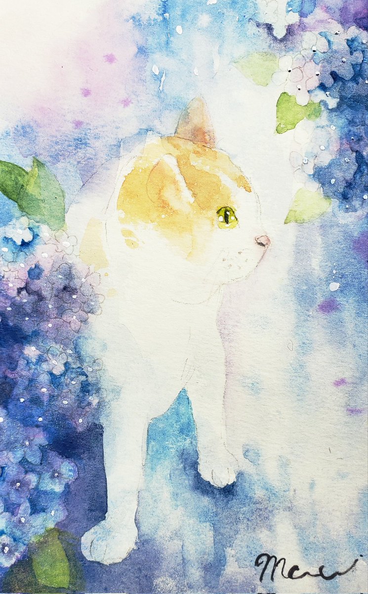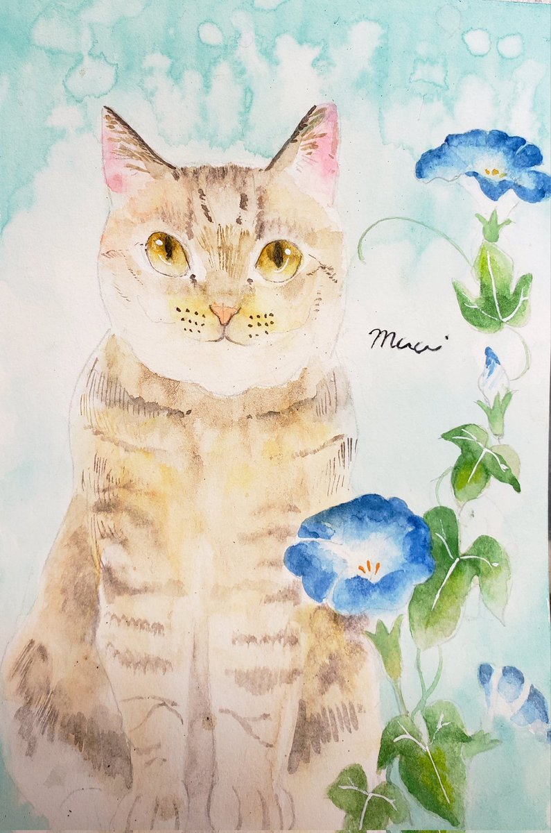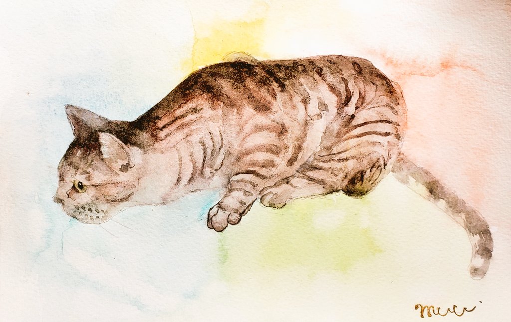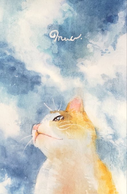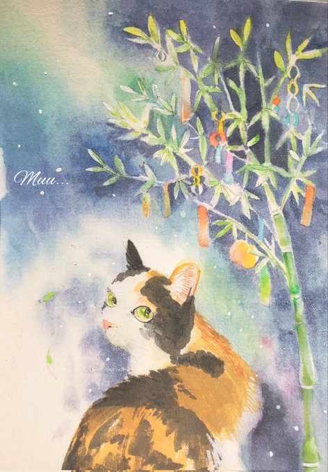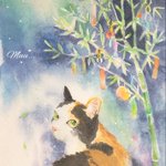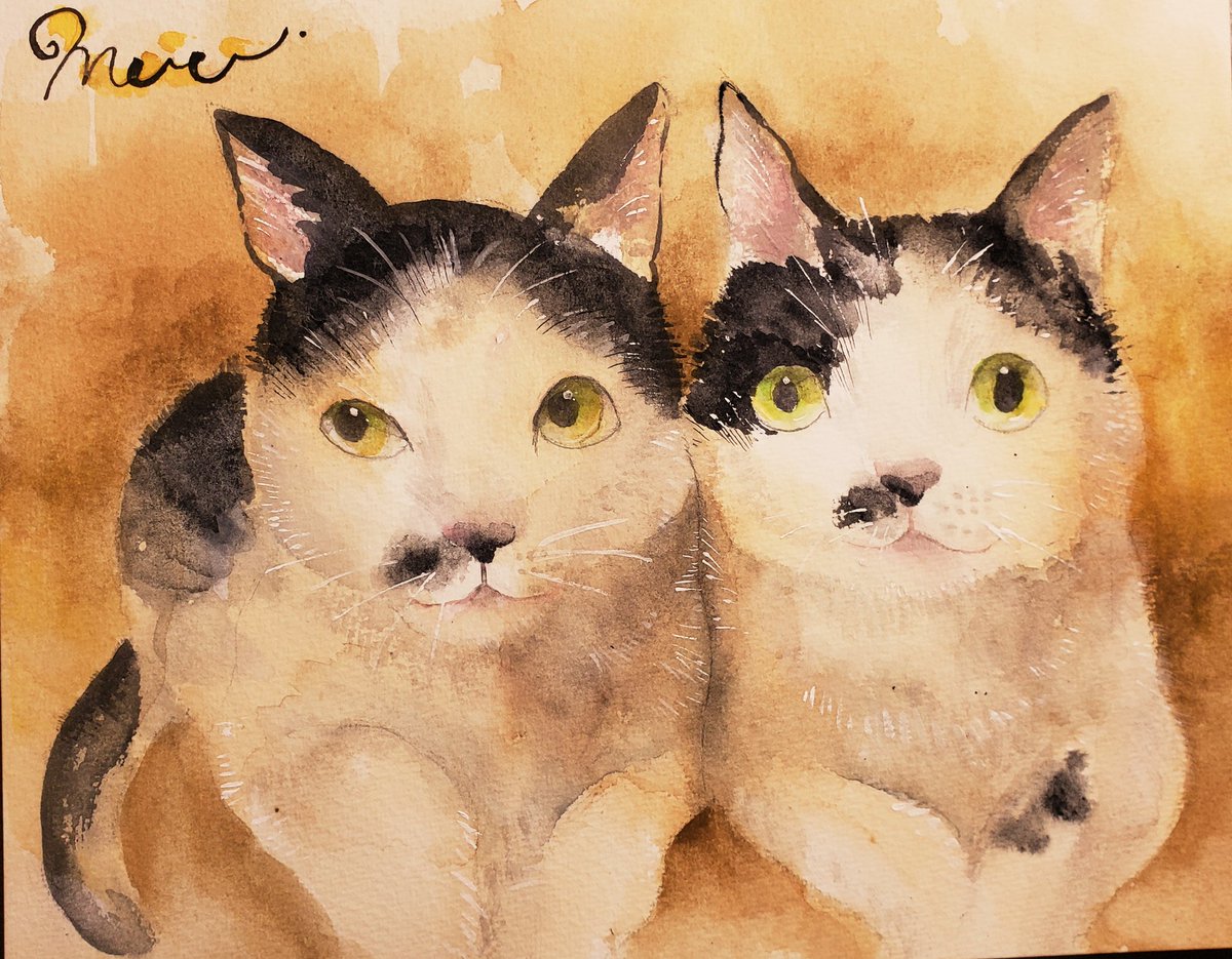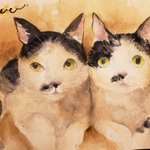 @Sazanka_352 さんの きぃちゃんとまめちゃんを 描かせていただきました。 月子さんをイメージして、 夜空、夕暮れ時を表現してみました。 はがきサイズ。ウォーターフォード。 #透明水彩 #猫好きさんと繋がりたい #絵描きさんと繋がりたい #ご依頼