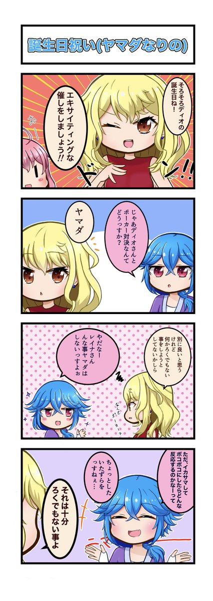 改めてヤマダ登録日おめです! ディオの誕生日に張り切る皆(ヤマダだけ方向性が違う)の4コマ漫画! #東京ドールズ #東京ドールズファンアート #ドール登録日