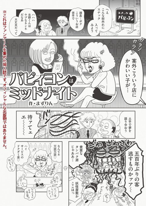 初めて同人誌に参加しました❤️岡田あーみん先生リスペクトのファンブックです👓わたくしはパピィとキャプテンがスナックをやるマンガ「パピィヨンはミッドナイト」を描きました!楽しかった〜! 通販もあるようです↓ あーみんゴッコ』C-102新刊【8月下旬より発送開始】 keiichisennsei.stores.jp/items/64bd27df…