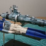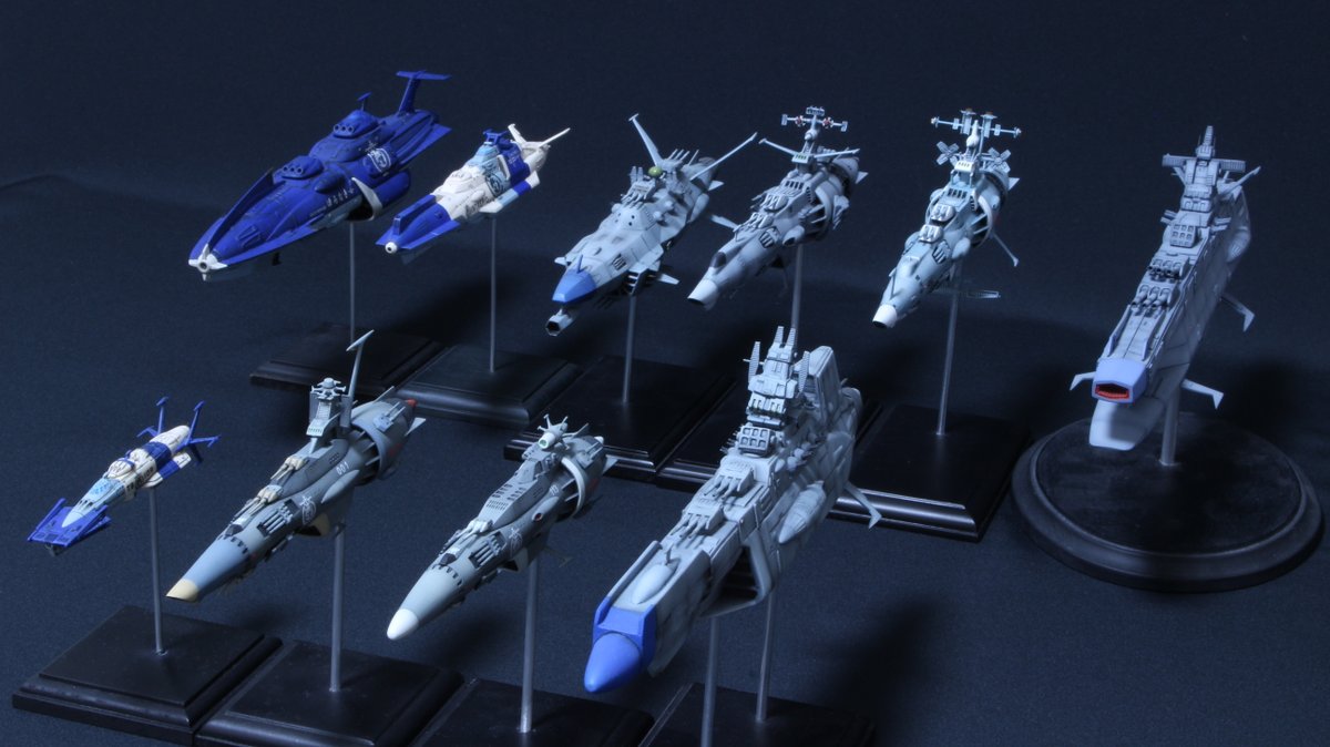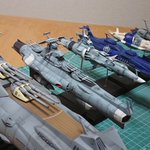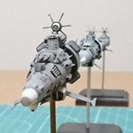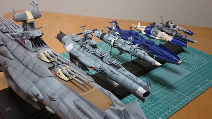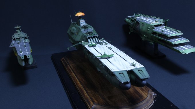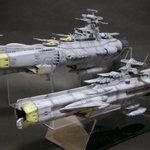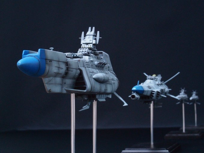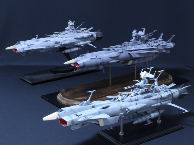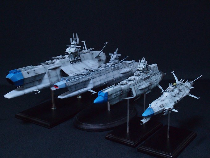 我が家からは2202版以前のアンドロメダ級揃い踏みで!!(^^) 奥:旧1/700 真ん中:旧1/700改造しゅんらん 手前:エルステッドさんガレージキット #宇宙戦艦ヤマト立体・イラスト作品集 #エアコミケ #サークル