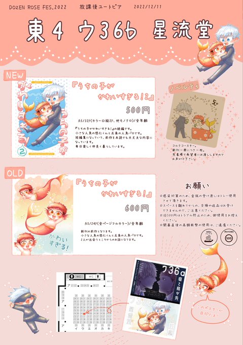 12/11 のお品書きです。 無配も間に合えば用意したいと思いますので、お気軽にお立ち寄りください✨ 口兄では初のイベント参加で不慣れなこともありますが、よろしくお願いします。 pixiv.net/artworks/10331…
