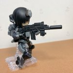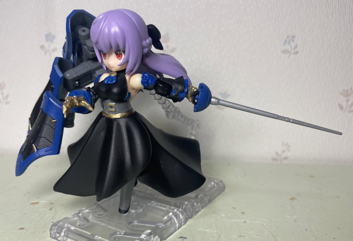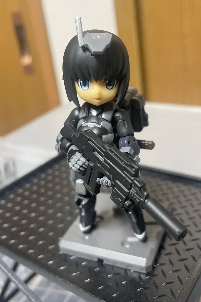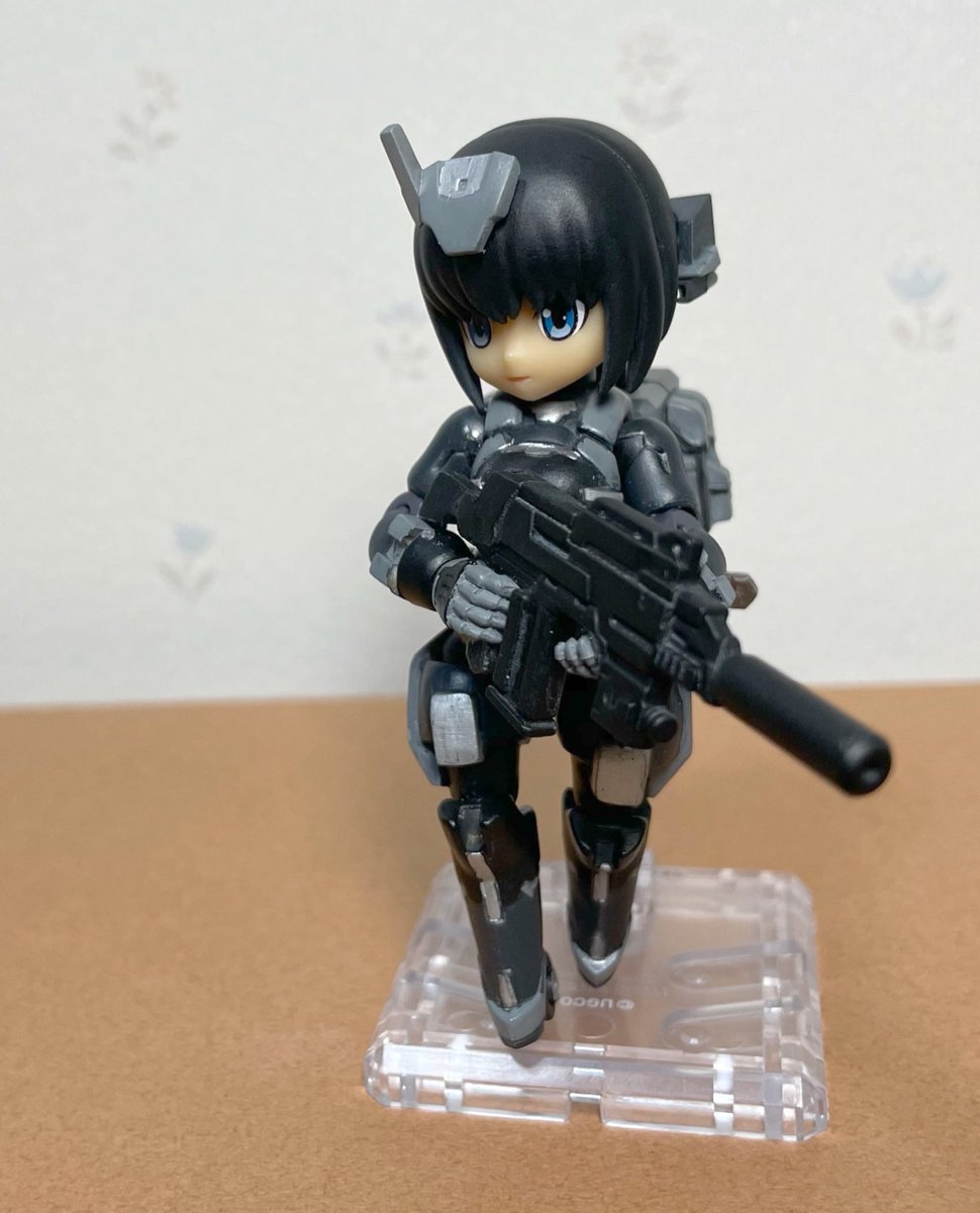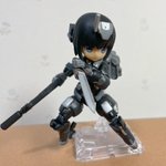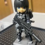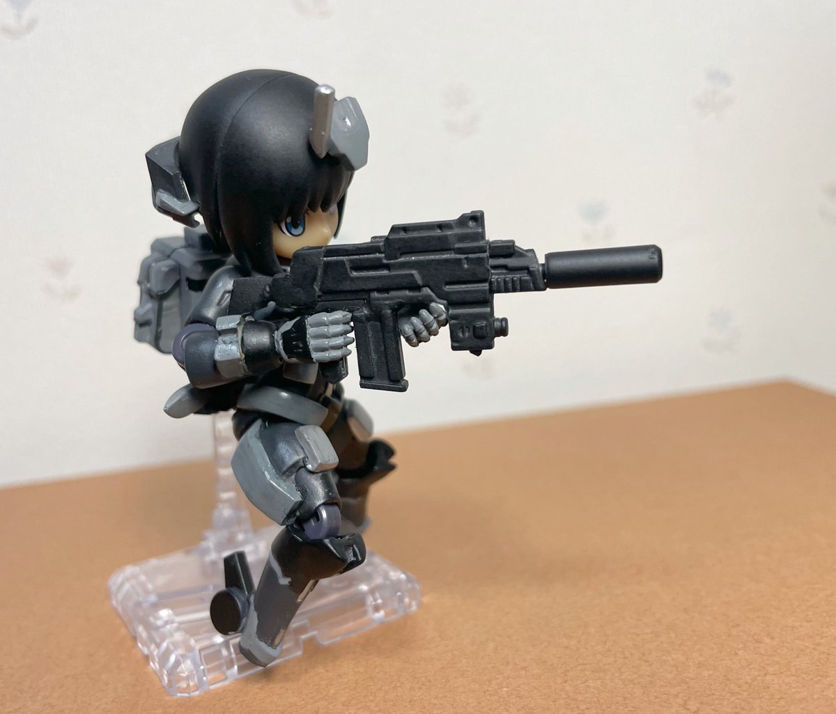 【コンテスト参加】 【応募条件に同意します】 【戦闘】 #デスクトップアーミー #コトブキヤ 装甲兵型D-phone 『ライトリィ・ブラック』 全身に装甲アプリを着込んだ機体。 軽量タイプの装甲アプリにより、柔軟な運動性を持つ。ライフルは追加弾倉やサプレッサーによるカスタムが施されている。