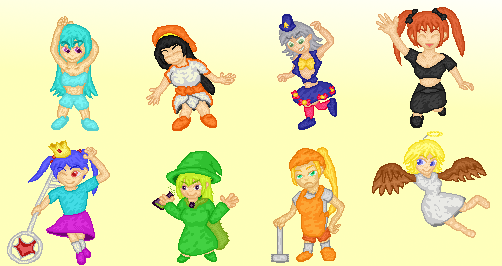8人揃ったので、隊列的な感じにまとめ。 デーリッチちゃん、ローズマリーさん、ジーナさん、ハピコ、雪乃、福ちゃん が主力かな。 #ざくアクアート #ドット絵