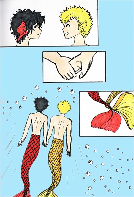 Continuing comic of mer-Akira and mer-Ryuji meeting up. #MerMay2020 belated day 25. (Sorry, today was busy😩) #MerMay #AkiraKurusu #RenAmamiya #RyujiSakamoto #mermaids #mermen #merfolk #akiryu #pegoryu #renryu #fanart #Persona5