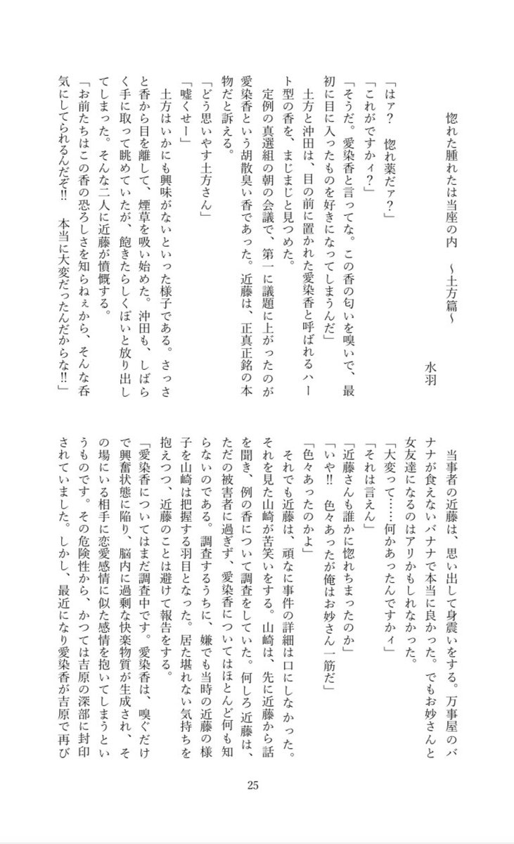 【10/16 かぶき町大集会12】 土沖合同誌 新刊サンプル 『惚れた腫れたは当座の内』A5 /50p 肉片さん(@000mayo0000 )との合同本になります❣️ 作中に登場する惚れ薬、愛染香をテーマにした漫画と小説です。 pixivにてサンプルを公開しております!↓ pixiv.net/artworks/10193…