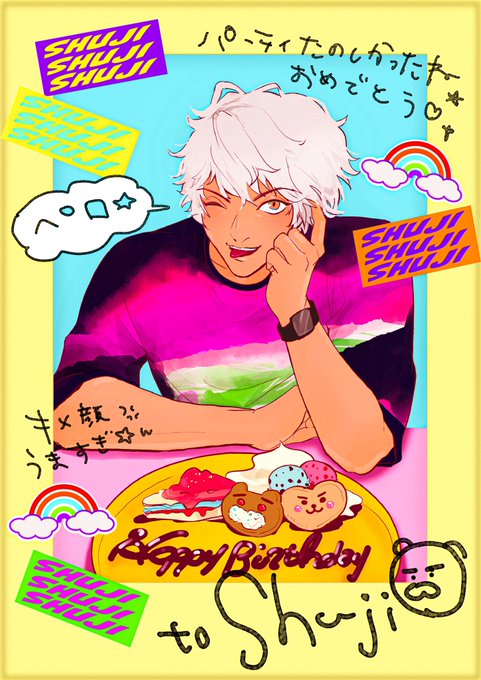 ぜんぜん間に合ってないすぎる 修二の誕生日絵をあげます、☺️☺️笑 かわゆ〜〜なカフェで誕生日会したときのチェキ、シールでデコりました。 (という夢絵🖼) #ガシマ先輩 #種ヶ島修二誕生祭2022 #種ヶ島修二生誕祭2022