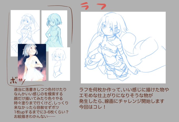 脳筋なのでベースが出来たらとにかく塗ります。というか塗るのが楽しいので頑張ってベースを生産しています。昔はちゃんと真面目に線画を描いて、下に色置いて乗算で影作って…とやっていたけれど、どうも形を捉えるのが苦手なので線画の時点で破綻してる事が多く、やり直しのロスが酷かったんです↓