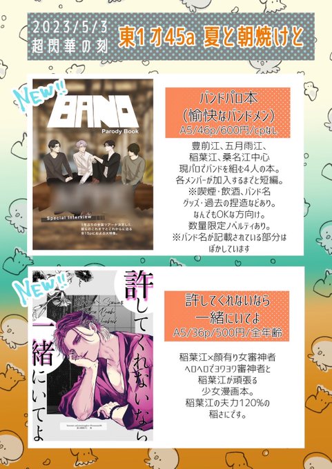23 33 5/3 超閃華 東1 オ 45a 「夏と朝焼けと」 南さん(@mnmrain06 )と参加です!南さんは最高稲さんの稲さに本、私はバンドパロ本を出します!よろしくお願いします! ※本のリンクはリプに貼ります ※アクキー、トートも在庫あるやつ持ち込むかもです!それも後日リプに貼りまーす! 23/04/28 21:25