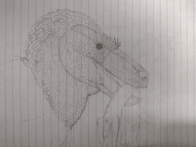 #Nanshiungosaurus brevispinus, a #therizinosaurus from southern China in the Nanxiong Formation, this #paleoart depicts the insectivorous habit similar to anteaters, in this case using your arms to destroy insects hives and using your tongue to catch insects
