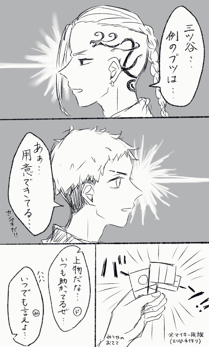 ドラケンと三ツ谷が闇取引❓する漫画 ドラケンが持ってる旗、三ツ谷の手作りだったら可愛いな〜とフォロワと話してたので描いた😄 #東卍FA
