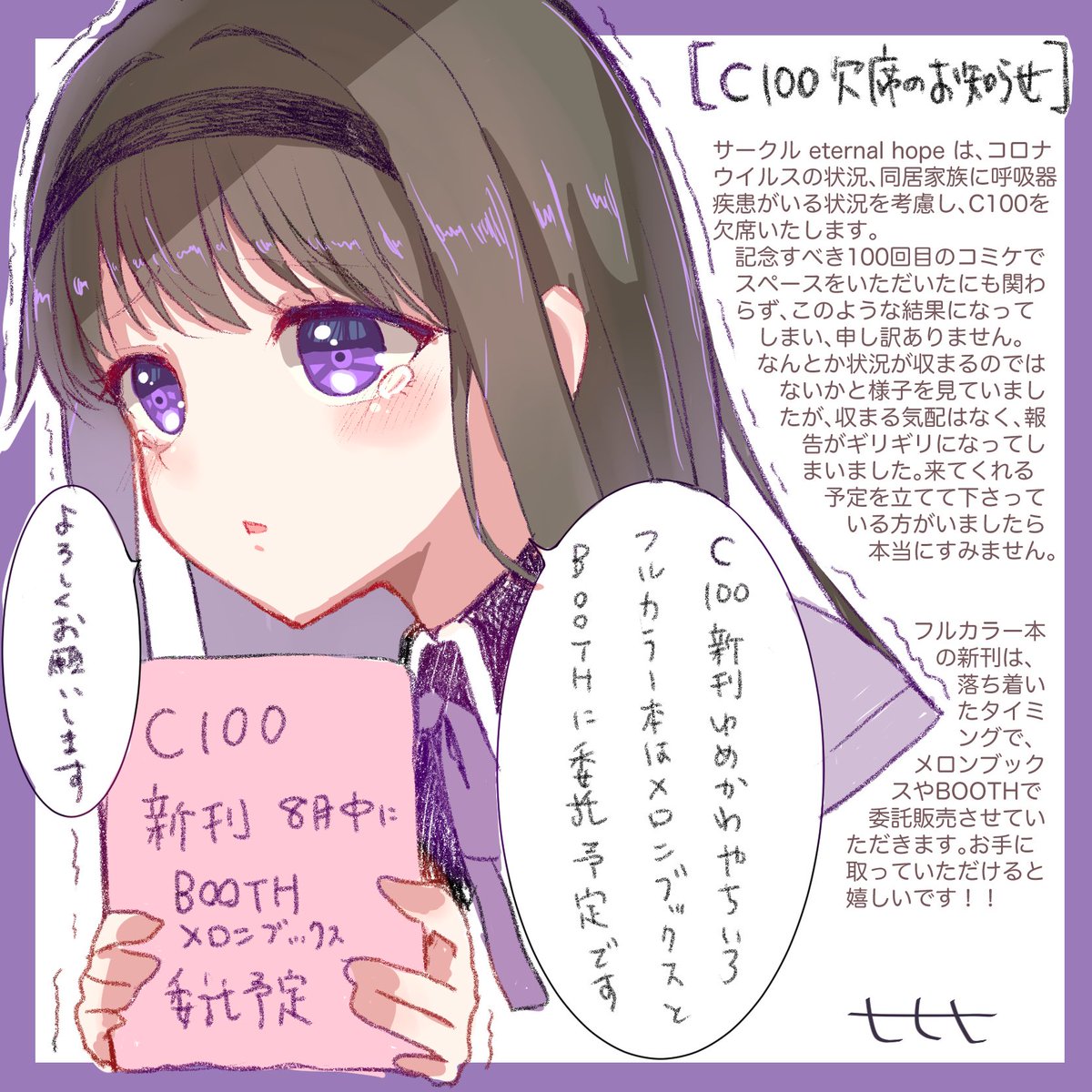 サークルeternal hopeはC100を欠席いたします。貴重なスペースに穴をあけてしまい申し訳ありません。新刊は後日委託を予定しております。