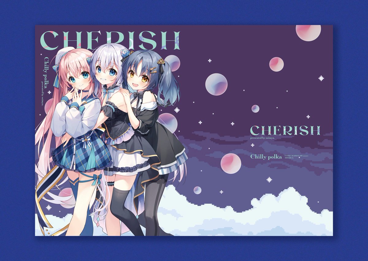 すいみゃさん @suimya の #C100 新刊『Chewy』『CHERISH』デザインさせて頂きました。 さわやかで暑い夏、そしてしっとりとした夜空なグラフィックを制作しました⛵️💫 委託情報✈ melonbooks.co.jp/detail/detail.…(特典つき) melonbooks.co.jp/detail/detail.… melonbooks.co.jp/detail/detail.…