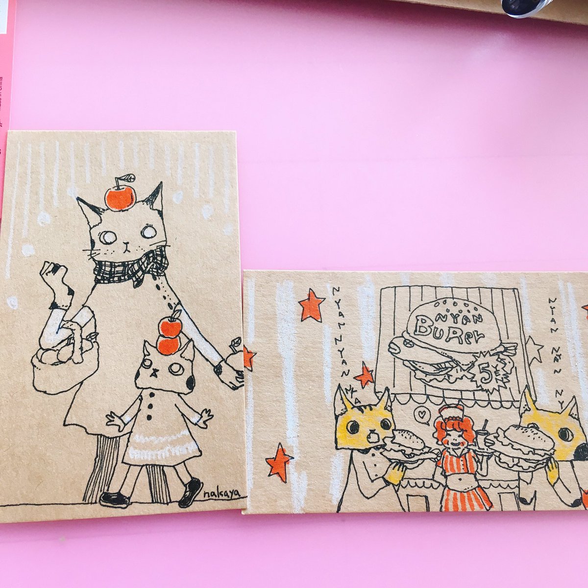 チャリティーの絵を隙間時間に描きました。ボジさんが猫気に入ってくれたみたいだから猫かいてみました スペル思いっきり間違えたのは気が向いたらなおします🍔✨ 出せそうなの選んで5〜10枚出そうかな🤔