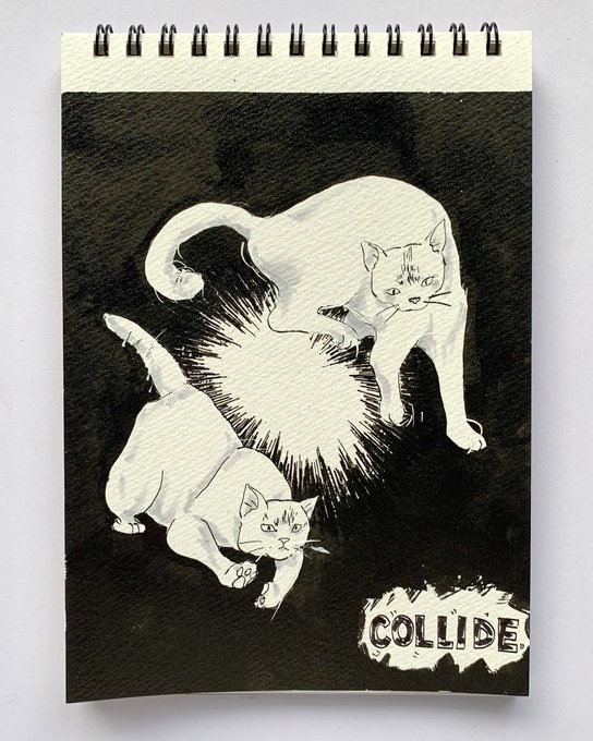 #kuretake_inktober2021 1日遅れで17日目「COLLIDE」衝突 難解なお題で、苦戦しました #inktober #inktober2021 #inktober2021day17 #zigsumiink #zig #kuretake #猫イラスト 呉竹のsumiinkは綺麗に黒が塗れますね😄水彩紙と馴染みが良い