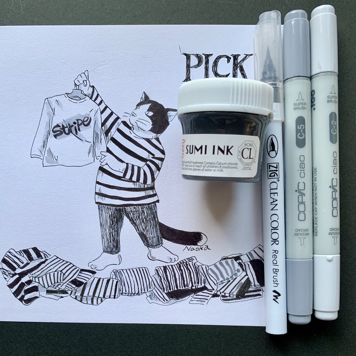 #kuretake_inktober2021 10日目「PICK」選ぶ ZIG SUMI ink,real brush COPIC 今日も夏の日のようでした 2021年もあと2か月半になりましたか #kuretake_inktober #inktober #inktober2021 #zig #copic #猫イラスト