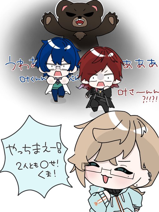 熊にいち早く気づく叶さんも 追われて悲鳴あげる2人も👍 #まめねことレオス #イロ絵す #かな絵