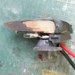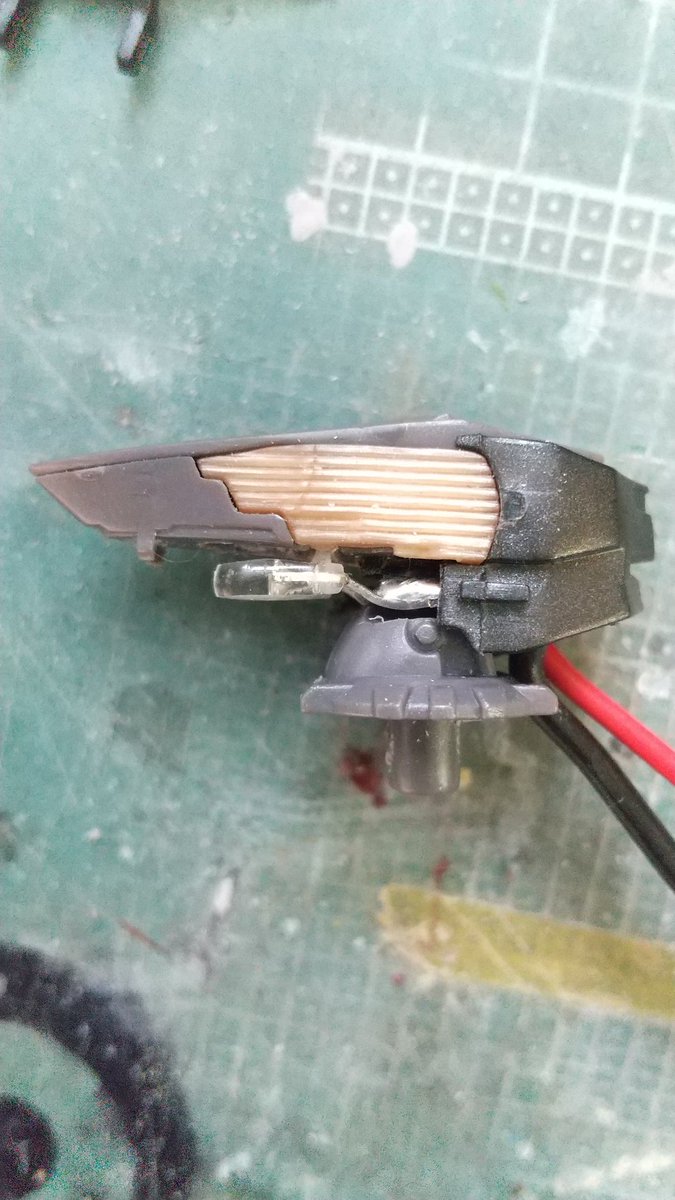 34 98 ACアリーヤ・シュープリス進捗 第一懸案箇所の頭部発光クリア。ひと安心。3ミリ砲弾型LEDを削って薄くして上下方向には高輝度テープを貼って光を遮ってます。メッシュはハセガワPA-22番で柱は洋白線 22/12/16 20:39
