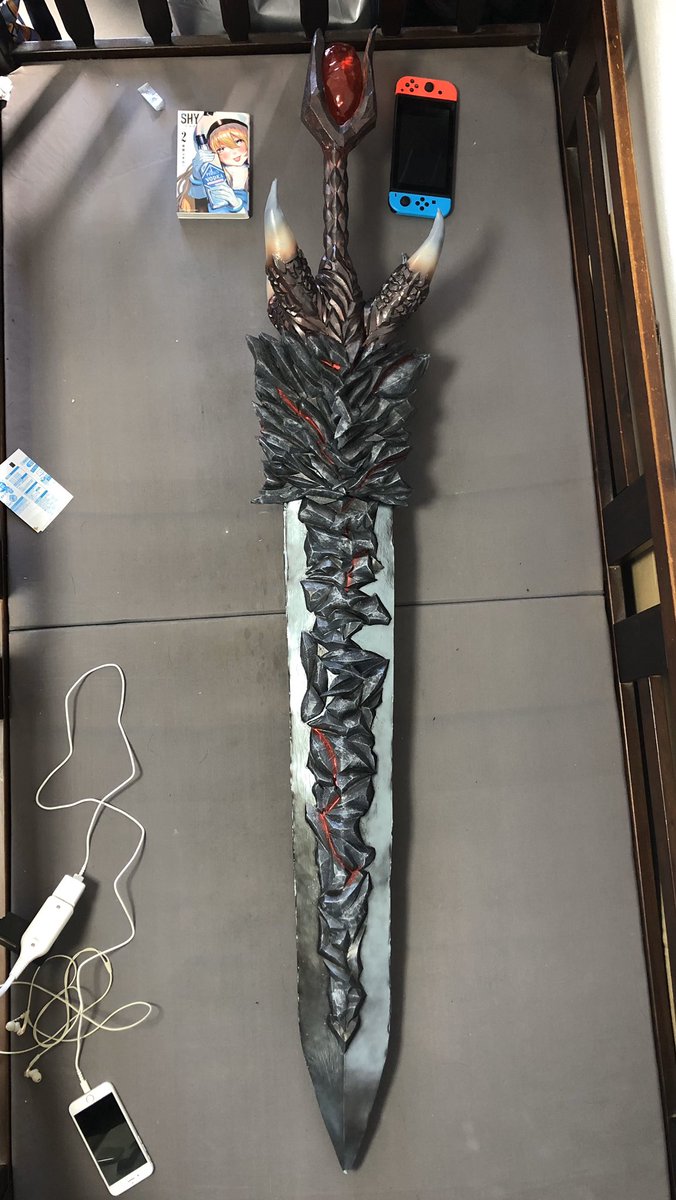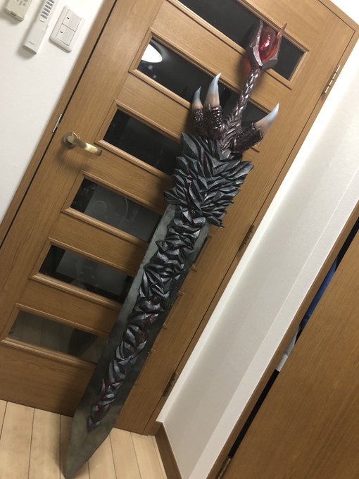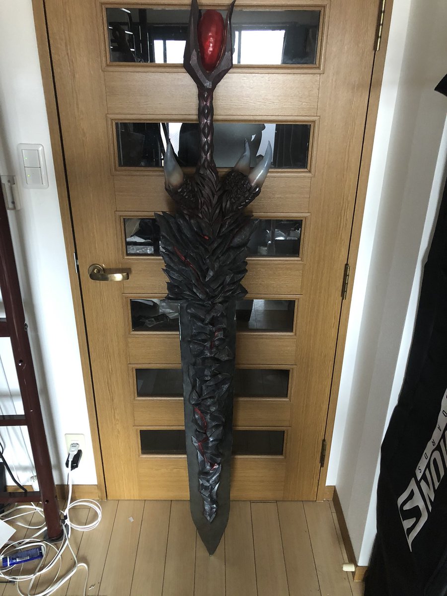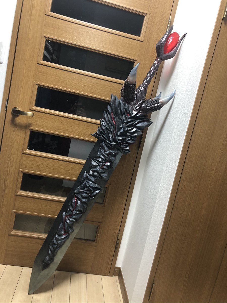 まだ細々と修正はするだろうけど DMC5の武器【魔剣ダンテ】無事完成!!!振り回せないけど片手で持てる! コスプレボードのハードタイプをメインで使い、アルミパイプを通してます。 柄頭の赤い宝石みたいなやつは下敷きをヒートガンで熱して型に押し付けたやつ×2を接着 #DMC5 #DMCcosplay