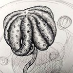 1 7 #ペン画 #制作途中 茹でたこ。茹でたこで表現するのは少々暗いテーマ。そしていつもみっちり描き込むけど今回は展示される環境を考えあえて余白をわざとにかなり作って描いていっているよ!。 20/10/08 22:44
