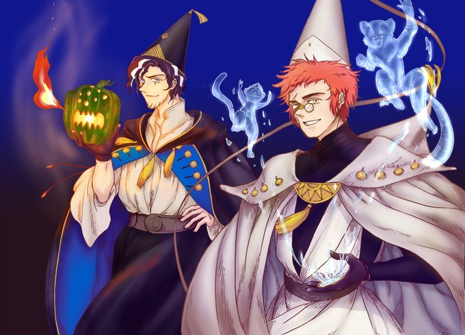 大遅刻のハロウィン絵🎃🦇 Devil May Cry 5のVとネロのコスで、ユウゴがV、ルーカスがネロ。ネロは右手を取られたすぐ後。コス元のは一対の手袋ではないし指なしですが、いつもの手袋してます🧤 本のVをYに変えてます✨ #ユウゴ・ルーカス10月祭り2022 今日は #1104の日 #いい推しの日