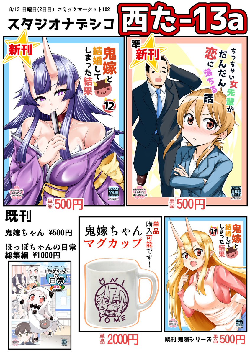 #C102 夏コミのお品書きです! スタジオナデシコの新刊は 『鬼嫁と結婚してしまった結果12』です(*´ω`*) Webカタログ webcatalog-free.circle.ms/Circle/17306193 通販 🍈 melonbooks.co.jp/detail/detail.… 🐅 ec.toranoana.jp/tora_r/ec/item…